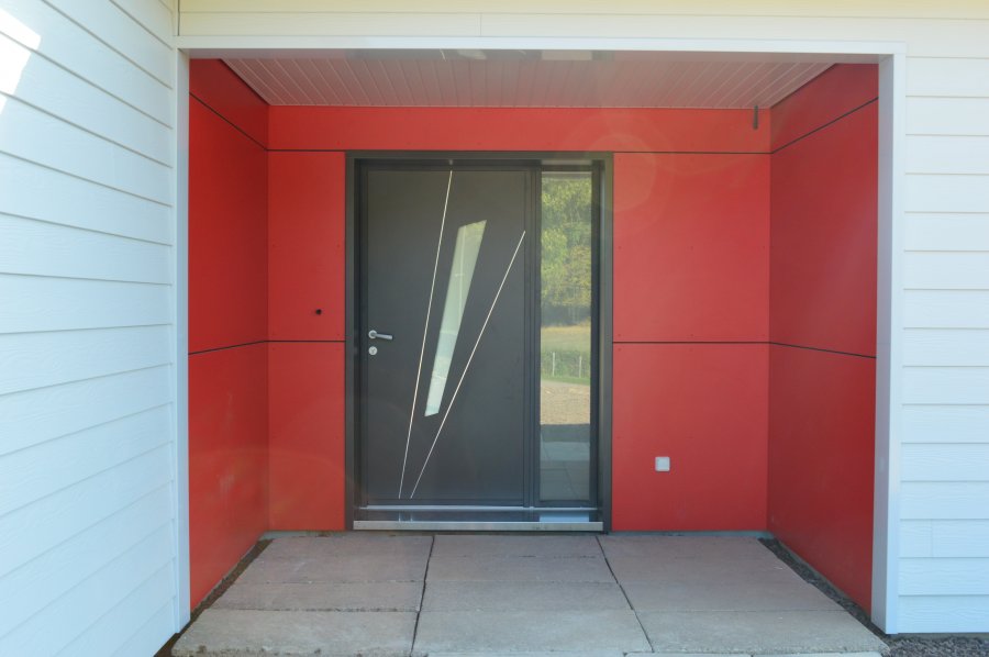 - Bardage fibro-ciment coloris gris argent et gris schiste, panneaux compact rouge sur entrée,