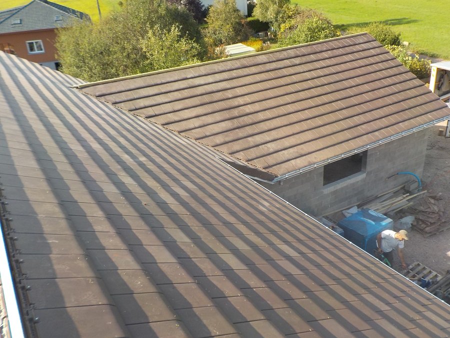 - Couverture en tuiles terre cuite plates brunes, zinguerie en zinc naturel,