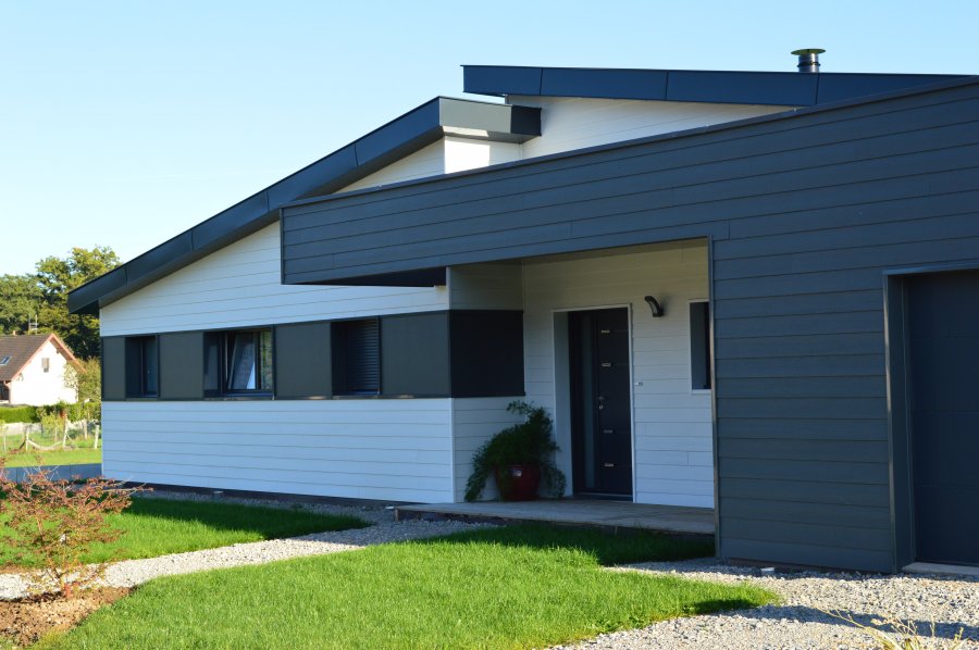 - Bardage fibro-ciment, coloris blanc artic et gris métal,