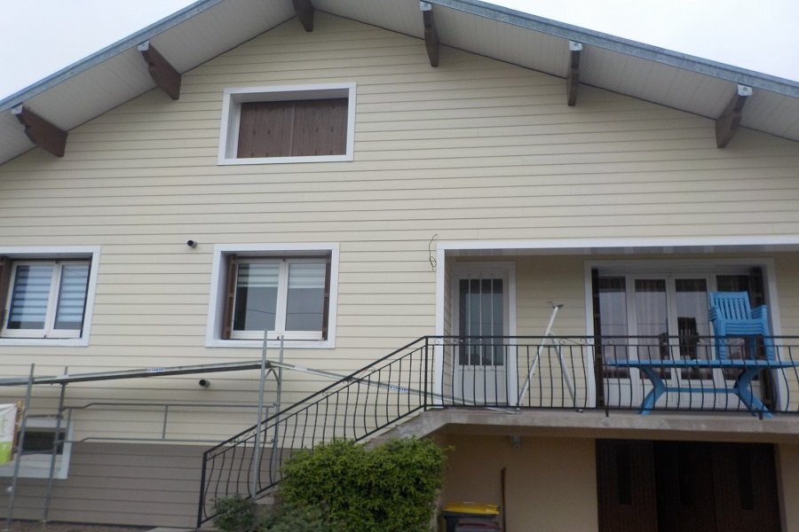 - Bardage lames fibro-ciment coloris vanille et brun atlas,
